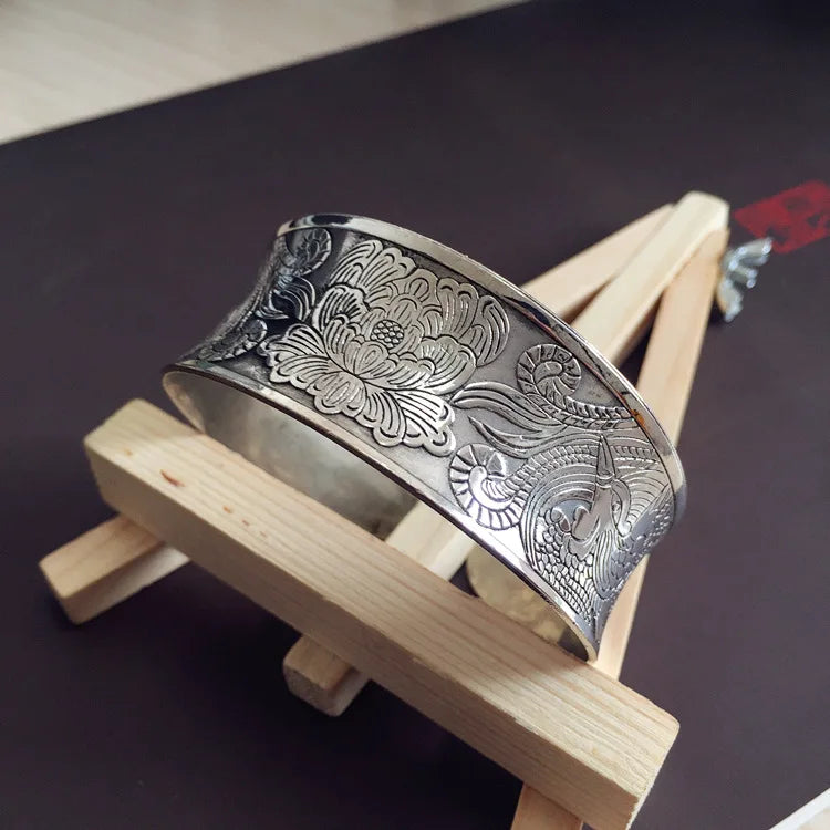 Bohemian Ethnic Style Retro Silver Wide Bracelet for Women Carved Flower Opening Fashionable Bracelet Boho Vintage Jewelry