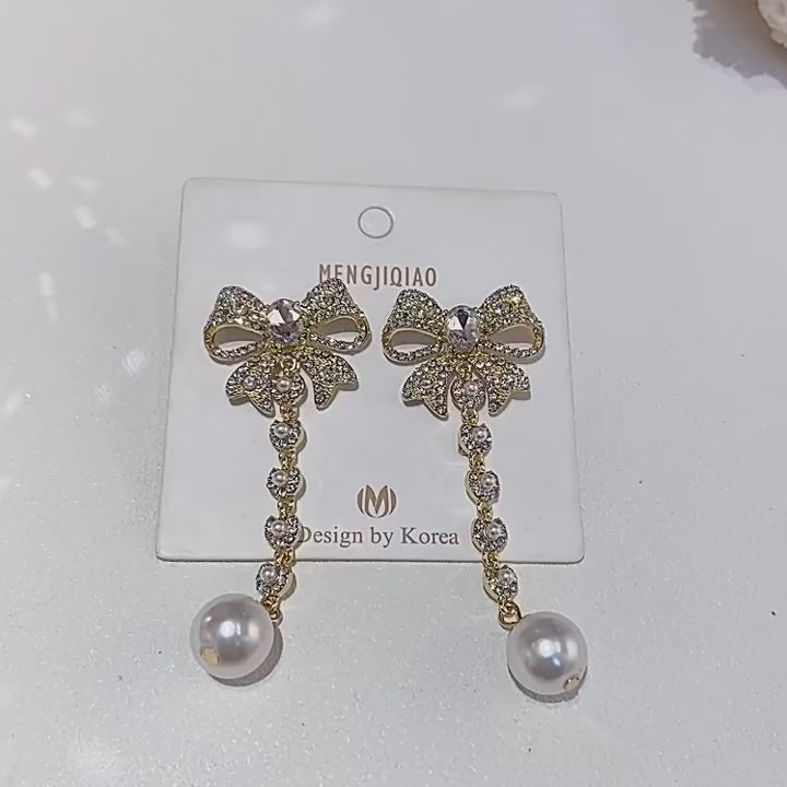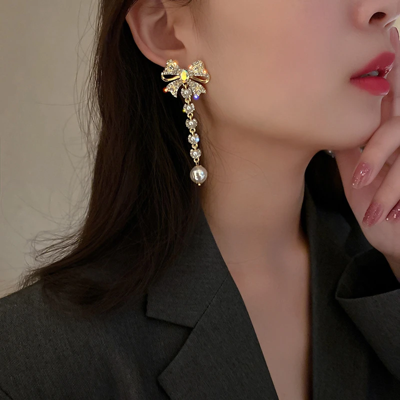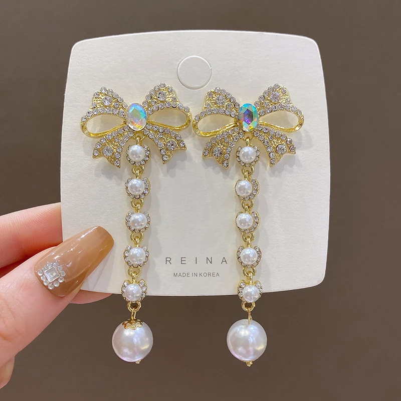 Korean Elegant Rhinestone Bowknot Drop Earrings for Women Girls Fashion Long Tassel Pearl Pendientes Weddings Party Jewelry