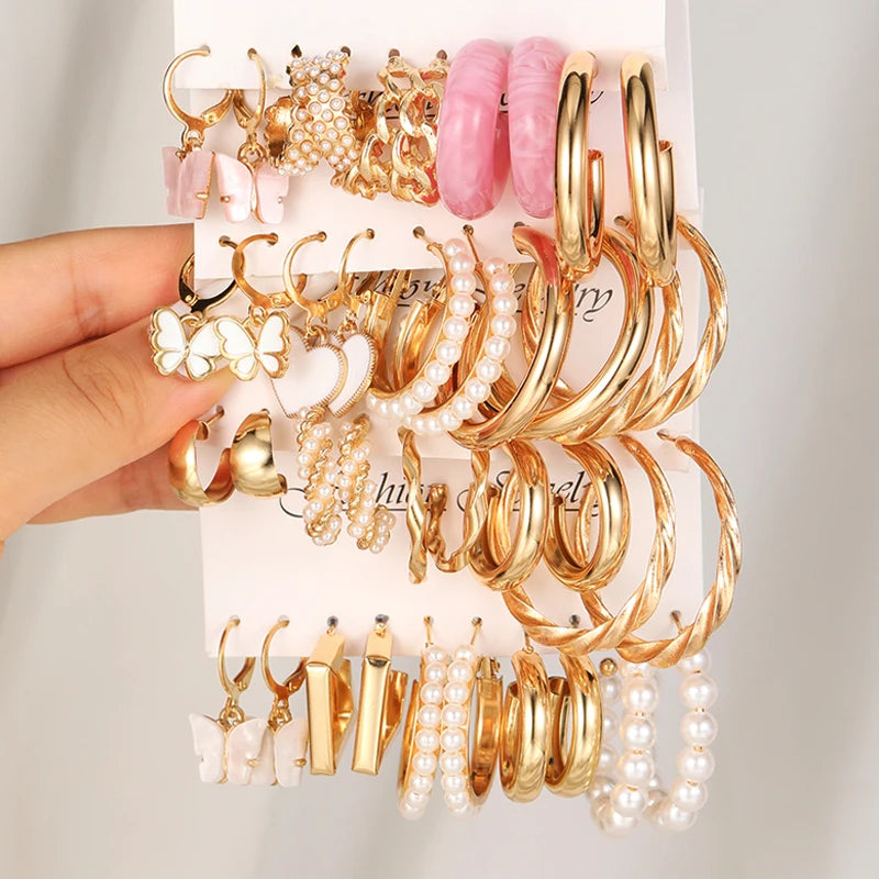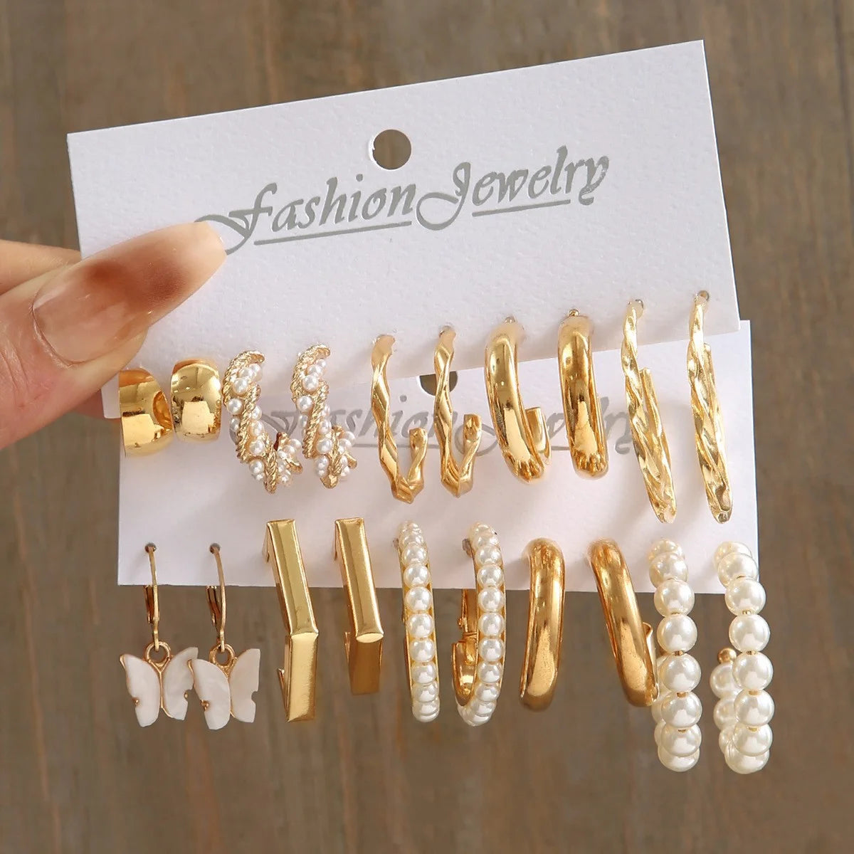 New European and American Earring Set for Women Gold Color Minimalist Big Circle Butterfly Heart Pearl Earrings Jewelry Gifts