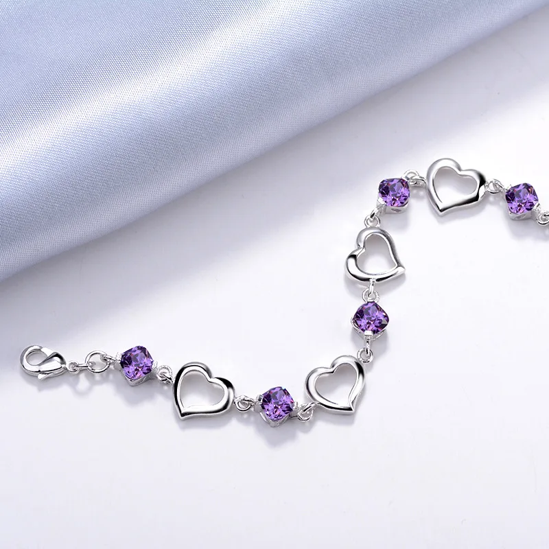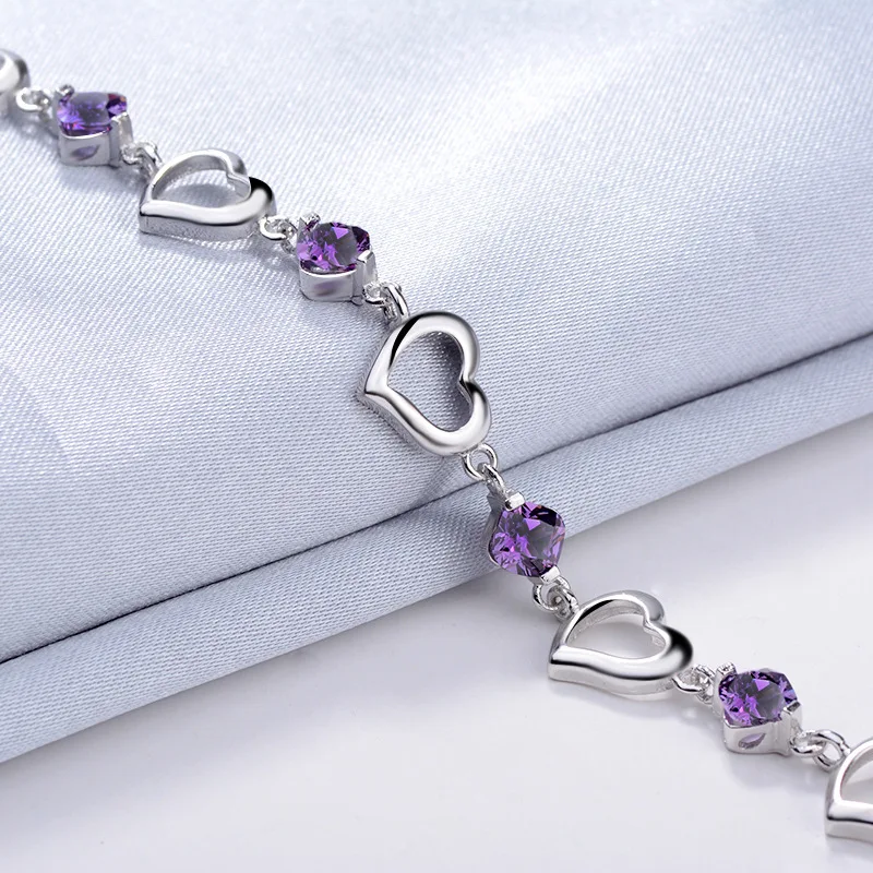 Sterling Silver Heart Shaped Bracelet for Women Vintage Purple Amethyst Bracelets Jewelry Set Party Jewelry Bangles for Women